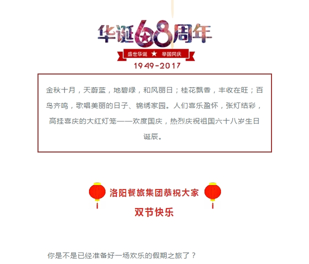 十月一千萬別離開洛陽!這份洛陽游玩超級攻略省錢又省時! 發(fā)布時間:2017-10-01來源:點擊:2472 以上信息來源于洛陽餐旅集團官網(wǎng):jqqty.cn 分享到:0 用手機看 拍下二維碼,信息隨身看 試試用微信掃一掃,在你手機上繼續(xù)觀看此頁面。 上一篇:“餐旅杯”河南省餐飲飯店三項大賽洛陽選拔賽拉開序幕 下一篇:河南省收藏家協(xié)會洛陽辦事處落戶喜慶文化博物館(籌)