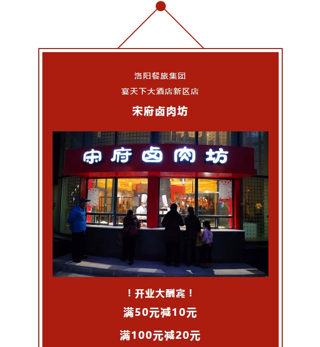 宋府鹵肉坊新店開業(yè)!滿50立減10元 以此類推! 發(fā)布時間:2017-11-25來源:點擊:2332 洛陽餐旅 宴會專家全國預(yù)訂客服熱線:400-616-3939微信號:hacyly股票代碼:836977長按二維碼識別后添加關(guān)注以上信息來源于洛陽餐旅集團(tuán)官網(wǎng):jqqty.cn 分享到:0 用手機(jī)看 拍下二維碼,信息隨身看 試試用微信掃一掃,在你手機(jī)上繼續(xù)觀看此頁面。 上一篇:中國收藏家協(xié)會副會長許諾軍等一行考察洛陽旅發(fā)集團(tuán)旗下華夏喜慶文化博物館 下一篇:美國中華藝術(shù)收藏家協(xié)會會長曹鑫參觀考察洛陽旅發(fā)集團(tuán)旗下華夏喜慶文化博物館
